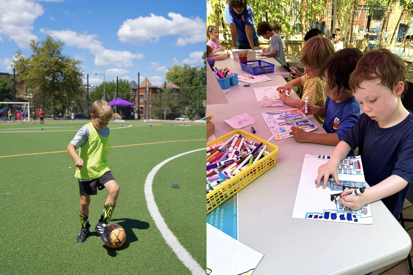 Each day combines soccer training, hands-on art projects, and neighborhood adventures. Kids play soccer in the morning, walk to a historic site on Capitol Hill in the afternoon, then draw or write about what they discovered. It’s movement, creativity, and exploration mixed together.